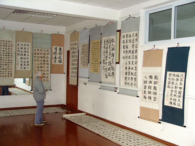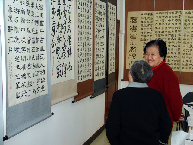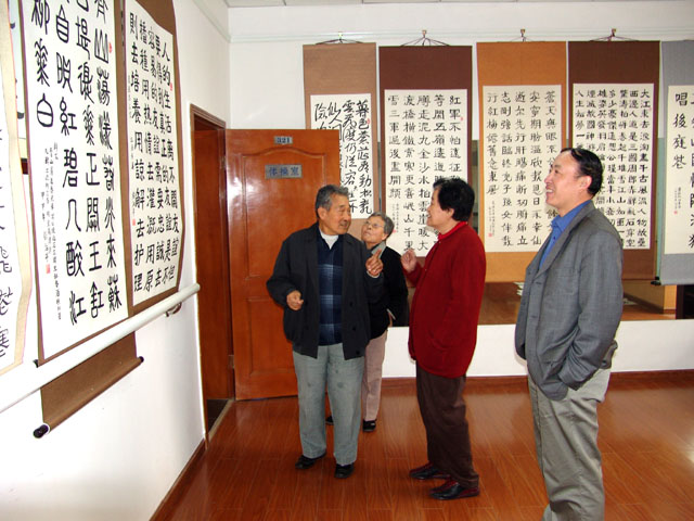 張治平先生在與參觀書法展的教師進行溝通交流。