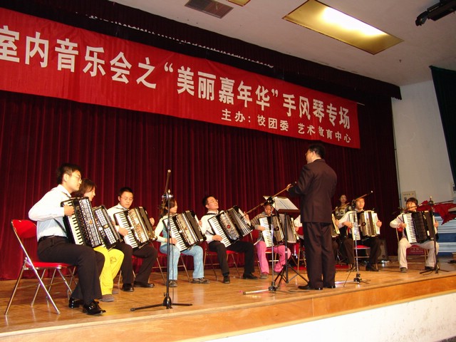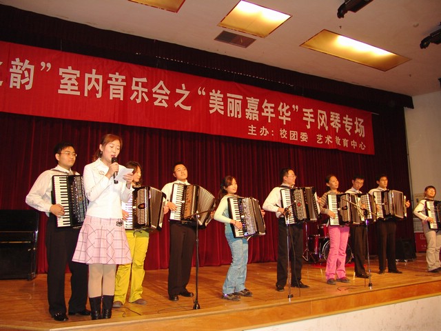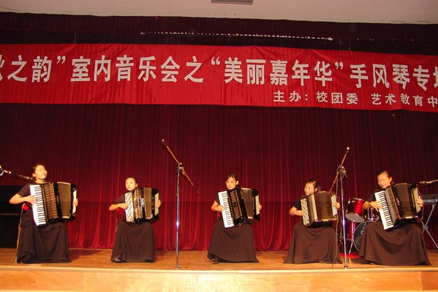 11月23日晚,2005年“秋之韻”系列音樂(lè)會(huì)手風(fēng)琴專場(chǎng)演出在中心教學(xué)樓一層報(bào)告廳舉行。音樂(lè)會(huì)在優(yōu)美的手風(fēng)琴合奏《美麗嘉年華》的旋律中拉開(kāi)了帷幕。