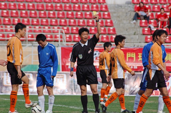 裁判員在向哈藥毅騰隊(duì)犯規(guī)隊(duì)員出示黃牌警告。