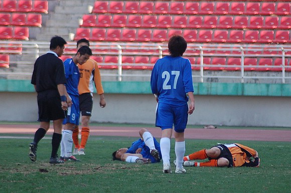 這絕對能稱之為一場慘烈的比賽,當(dāng)裁判吹響全場比賽的哨聲時,這支學(xué)生軍的場上隊(duì)員已經(jīng)拼盡了最后的力氣倒在了場地上。