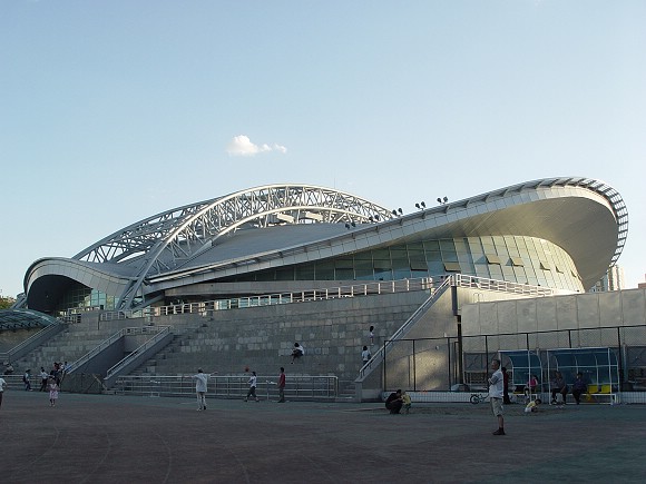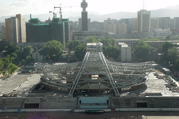 2005年6月1日,“六一”兒童節(jié)里的體育館,鋼頂結構已經基本完成。