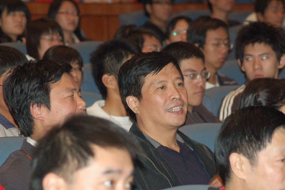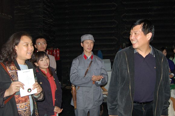 我校黨委副書記侯光明與大學生戲劇節評委會成員在交流。