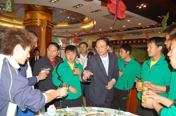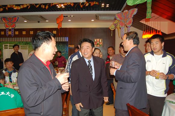 匡鏡明校長在舉杯預祝北京理工大學清研利華足球隊旗開得勝、馬到成功!