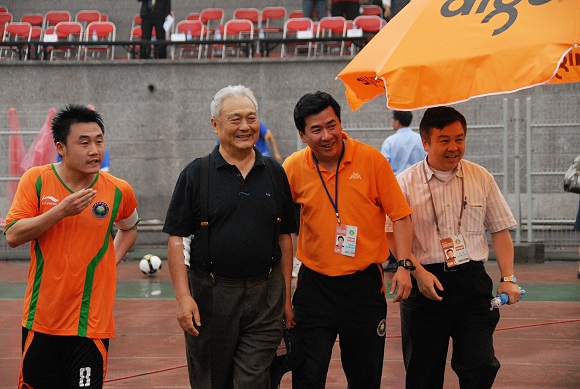 賽后,年維泗老先生應邀來到球隊中間,談了今天觀賽的感受。他說:“今天的比賽是我的學生和我學生的學生帶隊進行的比賽,看了比賽之后,最大的感受是:大家的精神面貌非常好,都把精力放在了踢球之上,我不用擔心場上會發生足球以外的亂七八糟的事情。大家也知道,今天晚上國家隊還有一場對伊拉克的比賽,但大家卻都很擔心。”
