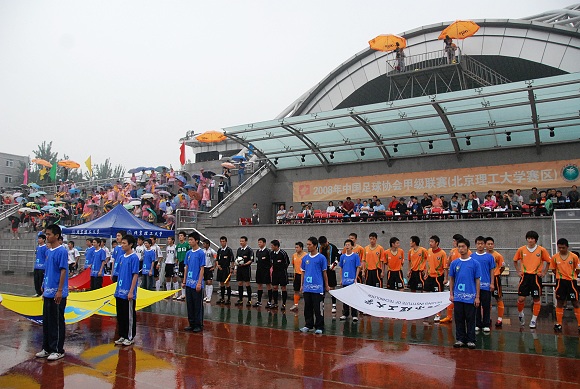 6月14日下午,一場引人矚目的大戰又將在北理工的主場進行,北京愛國者大學生足球隊將迎戰前來挑戰的上海東亞足球隊,由于北京從夜里就下起小雨,直到比賽開始雨依然沒有停,所以雙方不得不在北理工的主場面臨一場雨戰。這場比賽之所以引人矚目,是因為雙方的“掌門人”分別是徐根寶和金志揚,十幾年前,這兩位昔日在甲A的賽場上指揮申花和國安雙雄爭霸,并被足球界稱為“南徐北金”的流派代表人,后來都曾經擔任過國字號的教練,都有過輝煌的時刻。