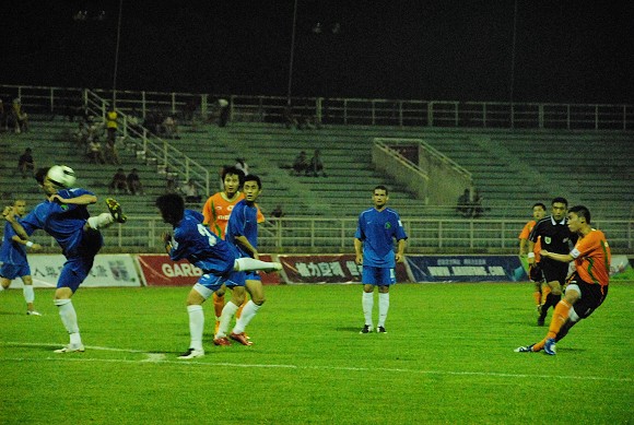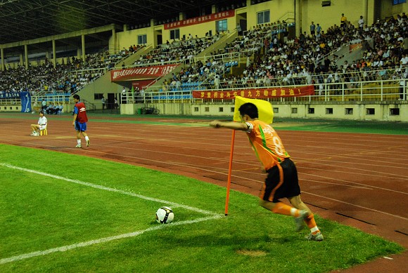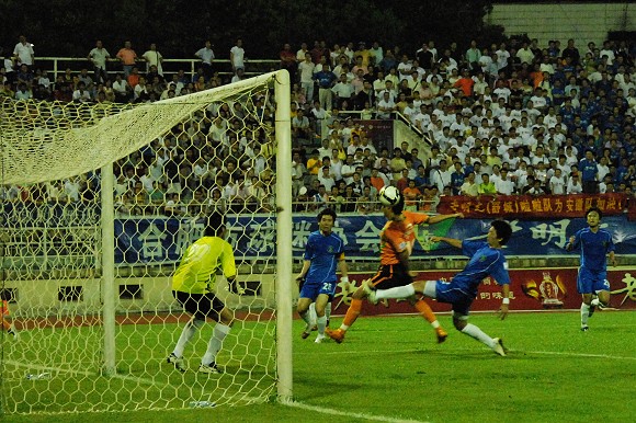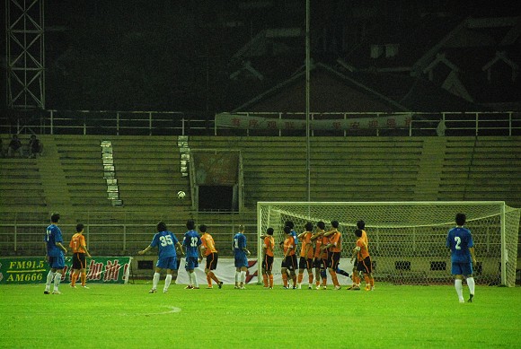 第18分鐘北京理工在禁區(qū)弧附近犯規(guī),九方隊(duì)獲得一個(gè)位置很好的任意球,霍頓主罰打飛.