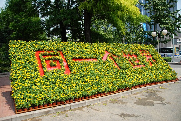 學(xué)校東大門的“Beijing 2008”主題花壇。