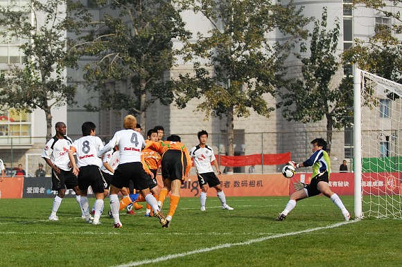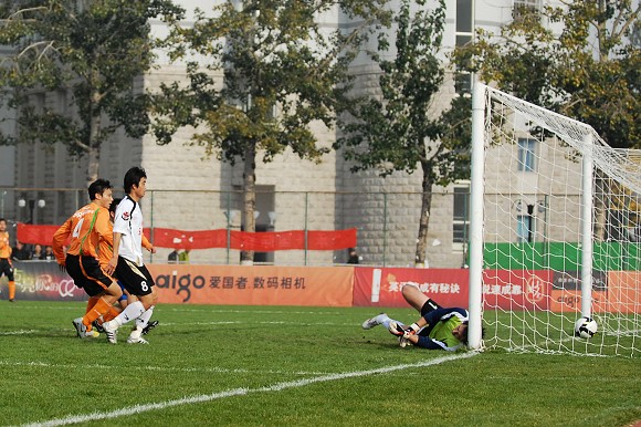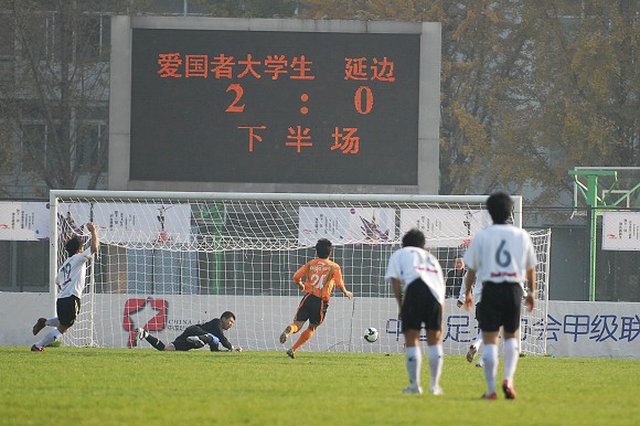 落后的延邊隊攻勢有所加強,但北理工的防守隊員并沒有給對方太多的機會。第33分鐘,延邊隊隊長韓松峰在禁區前一腳冷射稍稍偏出。1分鐘后,愛國者隊還以顏色,張淼在禁區前沿的遠射被對方后衛封堵,隨后楊思源接角球后的頭球攻門稍稍高出。