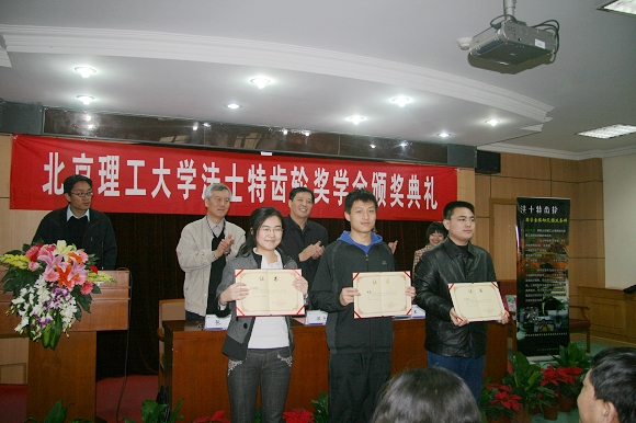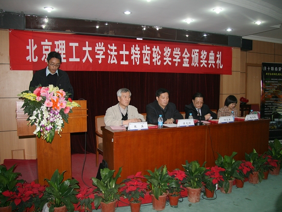 2009年3月30日下午,我校在中關(guān)村校區(qū)隆重舉行首屆法士特齒輪獎學金頒獎典禮。我校黨委副書記侯光明、教務(wù)處副處長林海、學生工作部(處)副部(處)長楊海、機械與車輛學院分黨委書記張英、機械與車輛學院分黨委副書記兼副院長閻艷等領(lǐng)導(dǎo)同志出席了頒獎典禮。陜西法士特齒輪有限責任公司銷售總部部長何志軍、我校84級校友、陜西法士特齒輪有限責任公司齒輪研究所副所長程書輝等同志代表出資企業(yè)出席了頒獎典禮。頒獎典禮由機械與車輛學院研工委書記徐貴寶同志主持。