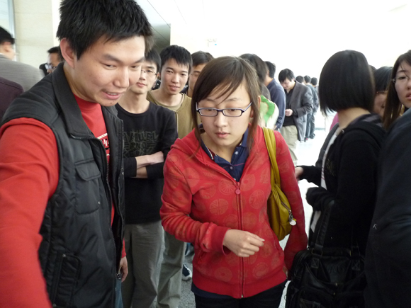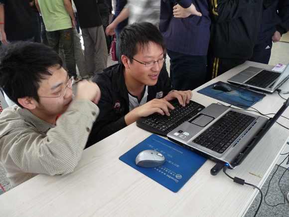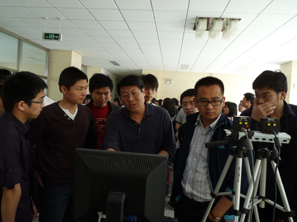 其中,“基于增強現(xiàn)實的廣場慶典互動式創(chuàng)意設計系統(tǒng)”展臺最為火熱,直觀逼真的展示方式吸引了眾人的眼球,以增強現(xiàn)實實現(xiàn)的廣場慶典、北京奧運會開幕式的擊缶表演模擬讓在場的每位同學都目瞪口呆。同學們一方面驚訝于屏幕上顯示的逼真效果,一方面積極向作者詢問相關技術及設計思路。由于參賽同學均為軟件學院2006級本科生,大家交流起來更加方便、更加順暢。