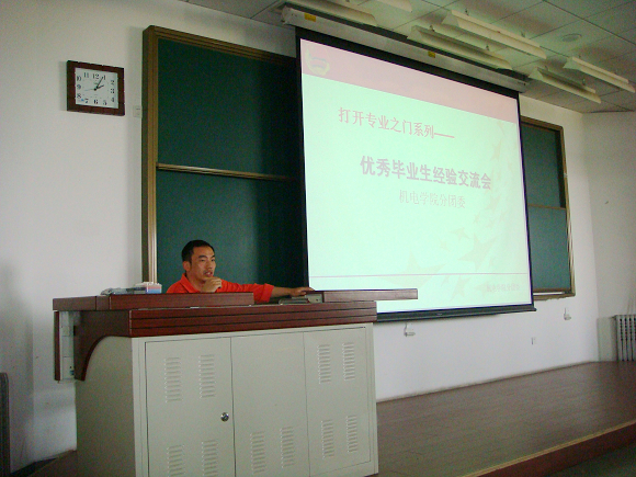 為切實踐科學發展觀,貫徹以學生為本的教育理念,積極創造條件,盡可能縮短低年級學生回到中關村校區后的適應周期。機電學院響應校團委“打開專業之門”系列活動的號召,于 5月17日下午在良鄉校區召開了“打開專業之門系列—2005級優秀畢業生經驗交流會”。本次交流會由學院副書記、副院長楊瑞偉主持,參加本次交流的老師有副院長韓峰、分團委書記方蕾、07級08級輔導員徐瑩瑩和陳登。2005級優秀畢業生朱旭、范睿、倪妍、高銀閣分別與在場的07級和08級同學分享了自己四年的大學生活。
