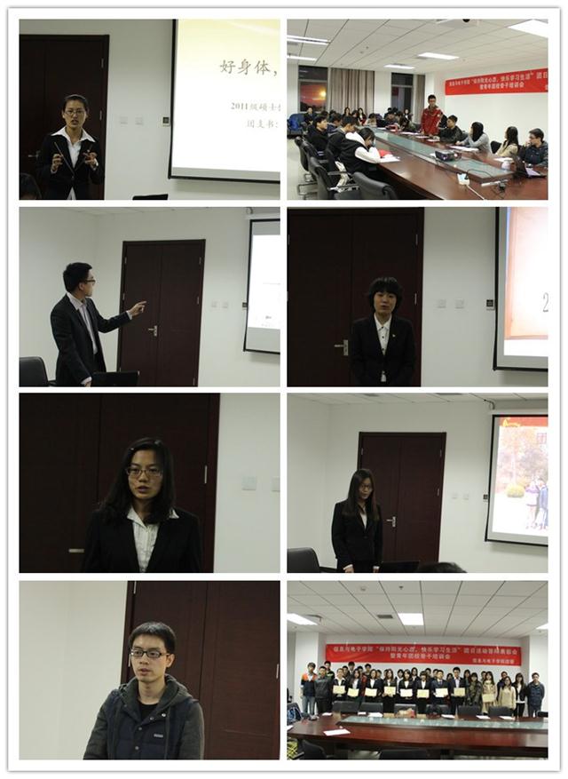 各團支部在活動結束后向學院團委提交了新聞稿、座談記錄和活動照片等材料。為表彰表現突出的團支部,樹立典型,加強引導示范作用,信息與電子學院團委從團日活動創意、實施效果、活動質量、總結材料質量等多個方面對各團支部開展的團日活動進行考核評比,并擇優予以表彰。11月25日,05411102團支部的“陽光運動 精彩未來”、05111002團支部的“傳遞健康,分享快樂,憧憬未來,感悟人生”、11碩信號二團支部的“好身體,好工作”、13碩電醫團支部的“堅定崇高信仰,保持陽光心態”等8個團日活動在學院團日活動答辯表彰會上進行了答辯,并由學院各年級的團支書擔任評委進行了評分。最終,05111002團支部以“體育技能一幫一”的形式、集體座談會的深刻教育意義和附加的放飛紙飛機的創意環節獲得好評,榮膺學院一等獎。13碩電醫團支部和05411102團支部榮獲二等獎,13碩微電團支部、11碩信號二團支部和05921001團支部榮獲三等獎,13碩通信一團支部和13碩信號二團支部榮獲優秀獎。