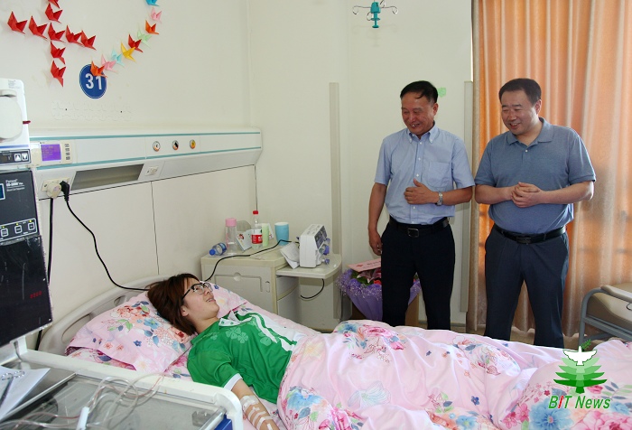 2017年5月24日,北京理工大學第六例造血干細胞捐獻者、機電學院2014級本科生張帆在海軍總醫院接受造血干細胞采集,隨著造血干細胞懸液從張帆身體里緩緩抽出,一次延續生命的接力就此展開。北京理工大學副校長王曉鋒一行帶著全校師生的祝福,前往醫院慰問正在接受造血干細胞采集的張帆。