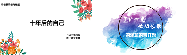 “通過(guò)‘立德’德育開題引導(dǎo)學(xué)生扣好人生第一粒扣子,表達(dá)書院對(duì)的德字輩書生不辜韶華,培養(yǎng)德行修養(yǎng)的美好希冀”教師劉敏在年級(jí)大會(huì)上向2019級(jí)書生闡明本次德育開題的主旨。明德書院以“立德”為主題,“德”作為2019級(jí)學(xué)生的字輩,也是品行道德之意,“立”表達(dá)了樹立、建立的含義。立德既是深入貫徹立德樹人這一根本任務(wù),又是明德書生在大學(xué)學(xué)習(xí)期間不斷涵養(yǎng)自己自身品格的過(guò)程。各班級(jí)結(jié)合書院大主題,擬定了如“德音不瑕,錦片前程”“遠(yuǎn)績(jī)不辭小,立德不在大”等班級(jí)主題。