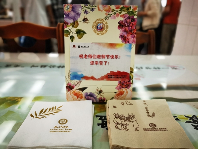 就餐期間,黨委教師工作部/人力資源部與餐飲服務中心,特別設計的北理工限量款教師節專用餐巾紙躍然桌上,向奮戰于各個崗位的教職員工致以節日的問候!