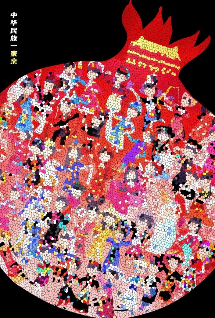 作品用象征民族團結的石榴果和由石榴籽組成、在天安門前翩翩起舞的各民族人物形象,寓意首都各族群眾團結和睦、親如一家。