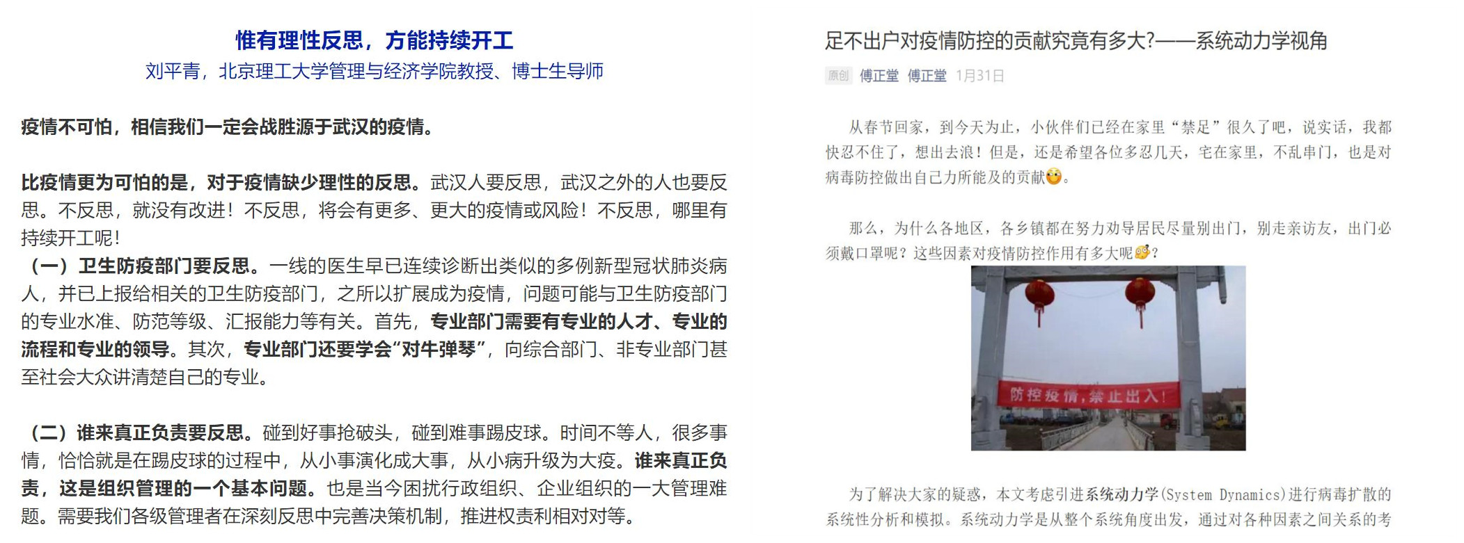 劉平青教授發布在新媒體“人力資源教授薈”的文章《惟有理性反思,方能持續開工》,從人力資源與組織行為學的角度出發,倡議社會各界從衛生防疫部門、誰來真正負責、人與自然關系、面對疫情心態、對生命的關注以及社會發展速度六個方面反思總結,實現個人、組織和社會的共同健康發展。2019級博士生傅正堂通過個人公眾號發布文章《足不出戶對疫情防控的貢獻究竟有多大——系統動力學視角》運用管理科學領域的系統動力學方法,采用仿真建模手段,從管理學角度分析了當前的防疫措施(戴口罩、勤洗手、少出門、不聚會等)對阻止病毒在人群中傳播擴散的重大作用,向社會大眾科普了居家隔離對疫情防控的重要性。
