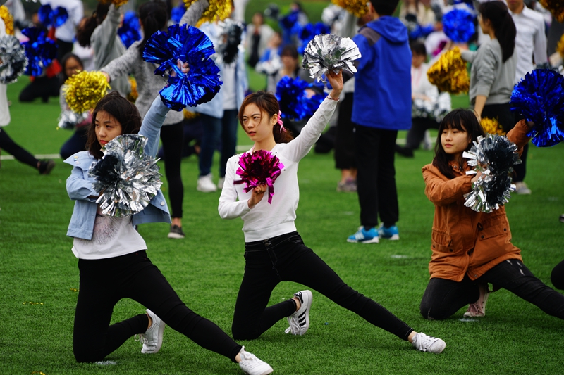 手拿花球一遍遍地練習(xí)跳躍、轉(zhuǎn)體等啦啦操動(dòng)作,還要踩準(zhǔn)音樂(lè)步點(diǎn),參演同學(xué)們訓(xùn)練地非常刻苦認(rèn)真。2016級(jí)外國(guó)語(yǔ)學(xué)院的王倩倩是第一次參加啦啦操項(xiàng)目訓(xùn)練,“這套動(dòng)作的難度不大,只要認(rèn)真就能學(xué)會(huì)。跳得過(guò)程中會(huì)要求自己把動(dòng)作做到位,做得有力度。雖然這樣會(huì)消耗更多體力,但是希望這樣能和大家把每一個(gè)動(dòng)作都做好做整齊。”