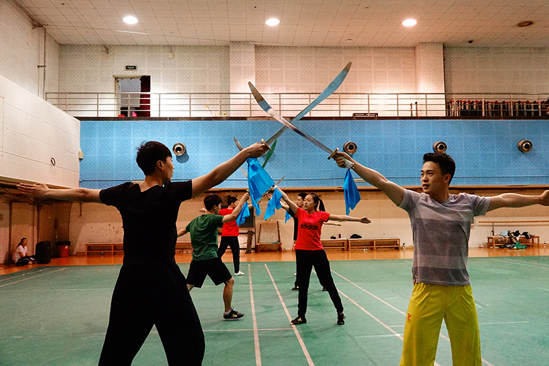 張老師則經(jīng)常奔波于兩校區(qū)之間,常常是上午還在良鄉(xiāng)校區(qū)上課,一下課就得趕往中關(guān)村校區(qū)指導(dǎo)武術(shù)隊(duì)的訓(xùn)練。“良鄉(xiāng)的體育課是日常教學(xué),這個(gè)不能放松,兩頭工作都得做好。不只是我一個(gè)人,體育部負(fù)責(zé)開幕式表演的幾位老師都是這樣的。”